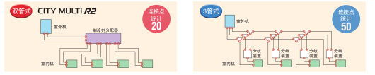 雙管式冷暖同步系統(tǒng)比較三管式同類系統(tǒng)來說,空調(diào)配管節(jié)點更少,提升了系統(tǒng)穩(wěn)定性。此外還減節(jié)省了安裝費,更有利于環(huán)境的可持續(xù)發(fā)展。