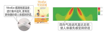 Move Move Eye動(dòng)態(tài)地面測溫技術(shù)即通過追加動(dòng)態(tài)地面測溫組件,使機(jī)組可以通過紅外輻射感應(yīng)地面溫度,自動(dòng)調(diào)節(jié)送風(fēng),防止過冷/過熱,提升舒適感的同時(shí)有效杜絕了能量浪費(fèi) 天花型卡式四向送風(fēng)內(nèi)機(jī)MoveEye可實(shí)現(xiàn)360°范圍地面測溫